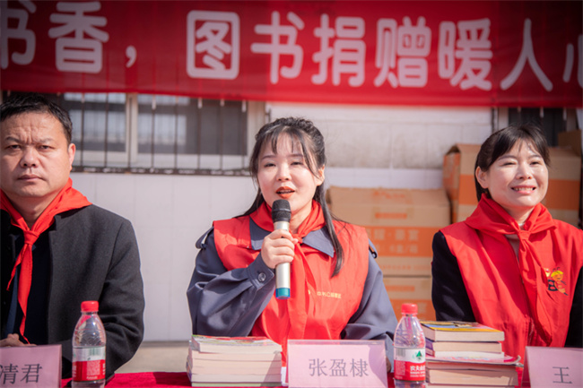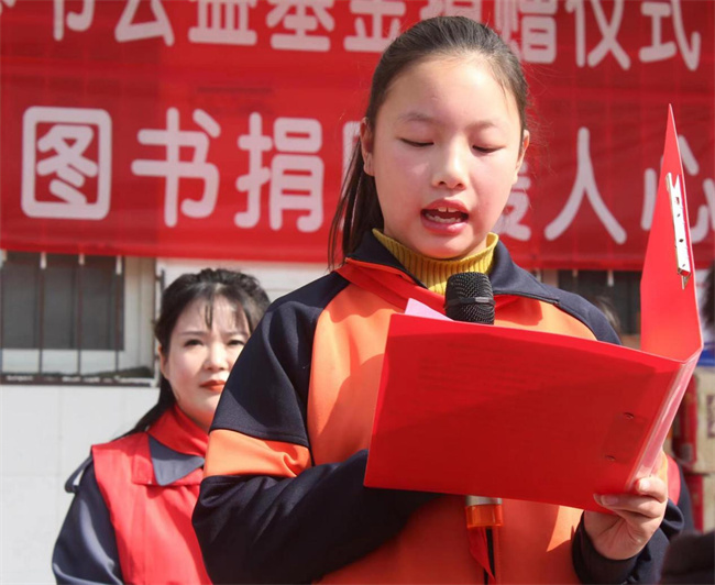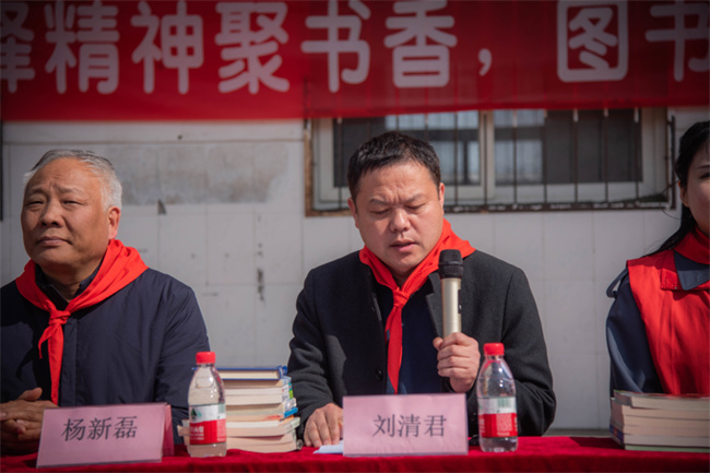 圖書捐贈儀式在同學(xué)們?yōu)轭I(lǐng)導(dǎo)及老師們敬獻(xiàn)紅領(lǐng)巾、齊唱《學(xué)習(xí)雷鋒好榜樣》中拉開序幕,而后由應(yīng)舉鎮(zhèn)黨委副書記劉清君、一本書公益基金會代表張盈棣、商貿(mào)系學(xué)團(tuán)辦負(fù)責(zé)人王婧先后發(fā)表重要講話,領(lǐng)導(dǎo)、老師們紛紛囑托東大村的孩子們好好利用圖書資源,努力學(xué)習(xí),成為黨和國家的棟梁之才,長大以后用實(shí)際行動報效祖國。隨后,學(xué)生代表向各位領(lǐng)導(dǎo)及老師們表達(dá)誠摯的謝意,表示定當(dāng)不負(fù)眾望,努力學(xué)習(xí),將來擔(dān)當(dāng)起建設(shè)祖國的重任。