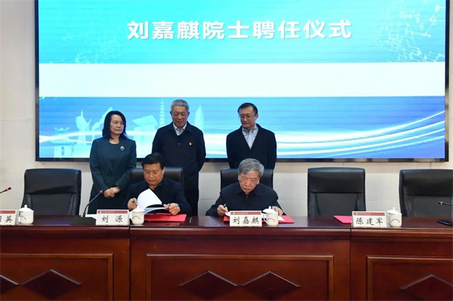 陳建軍書記為劉嘉麒院士頒發(fā)聘書