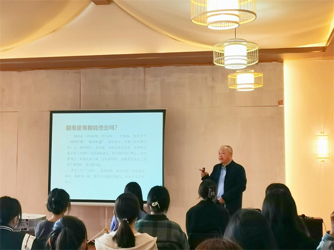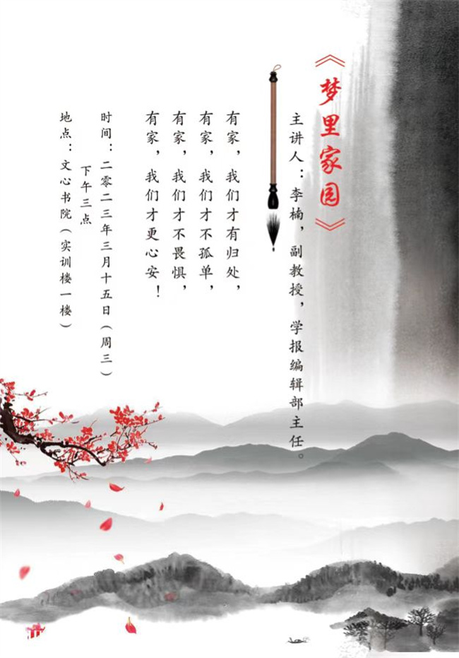李楠分別從《木蘭辭》《回鄉(xiāng)偶書》《十五從軍征》《望故鄉(xiāng)》等名家名篇來講述了我們對(duì)于家的理解和守望。有家,我們才有歸處;有家,我們才不孤單;有家,我們才不畏懼;有家,我們才更心安!陳華對(duì)講座進(jìn)行總結(jié),她期待更多的同學(xué)參與文心書院的精彩課程中,將文心書院當(dāng)作身體的歸宿、心靈的家園。