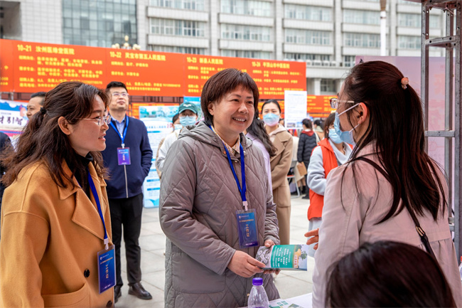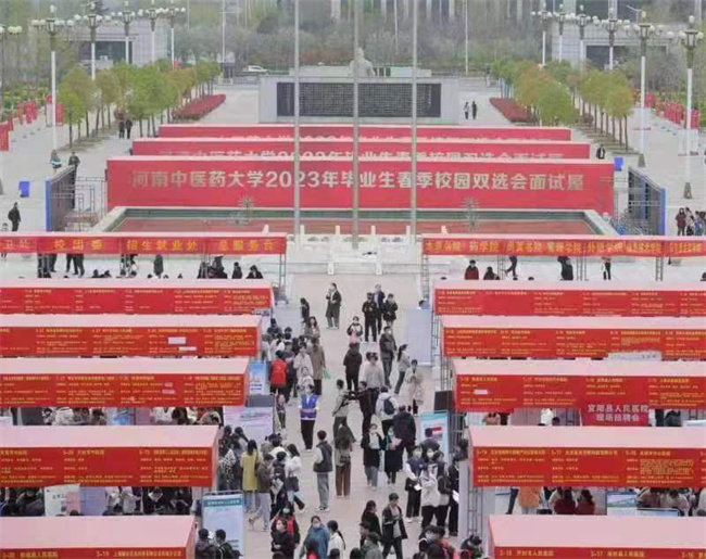中新河南網(wǎng)3月27日電(趙云 秦東仁 賴偉鵬 聶永強(qiáng)) 3月25日,河南中醫(yī)藥大學(xué)2023年畢業(yè)生春季校園雙選會(huì)在校龍子湖校區(qū)五星廣場(chǎng)如期舉行。校黨委書(shū)記李小芳,校紀(jì)委書(shū)記、監(jiān)察專員王少玉,副校長(zhǎng)田力、苗明三到會(huì)指導(dǎo)。學(xué)校招生就業(yè)處及其他相關(guān)職能部門(mén)、學(xué)院、書(shū)院負(fù)責(zé)人、畢業(yè)班輔導(dǎo)員全程參與,5000余名畢業(yè)生參加了雙選會(huì)。