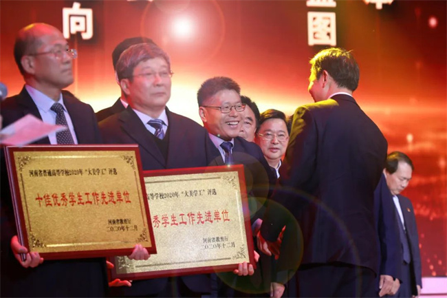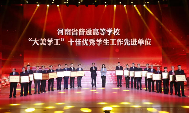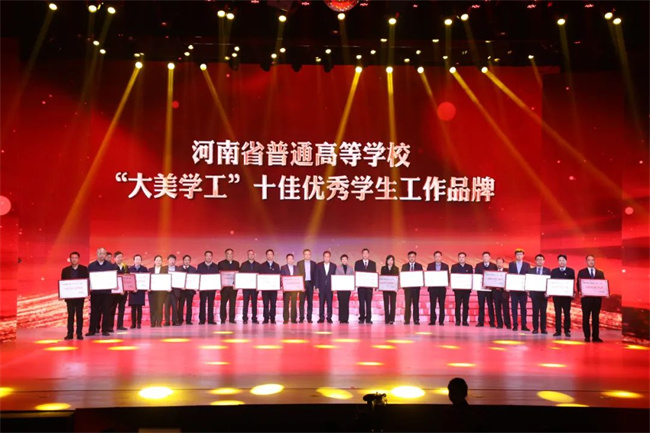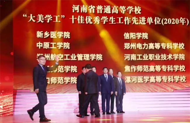 鄭州電力高等?茖W(xué)校黨委書記楊義波、副校長(zhǎng)黃鵬分別代表學(xué)校領(lǐng)取河南省普通高等學(xué)校“大美學(xué)工”十佳優(yōu)秀學(xué)生工作先進(jìn)單位、十佳優(yōu)秀學(xué)生工作品牌殊榮。