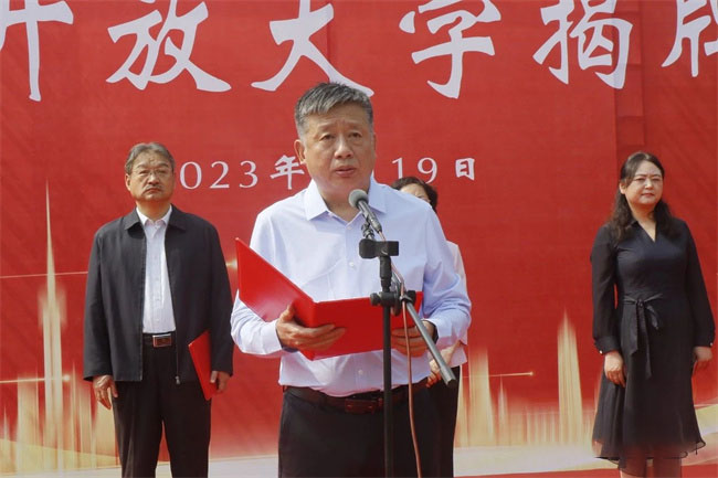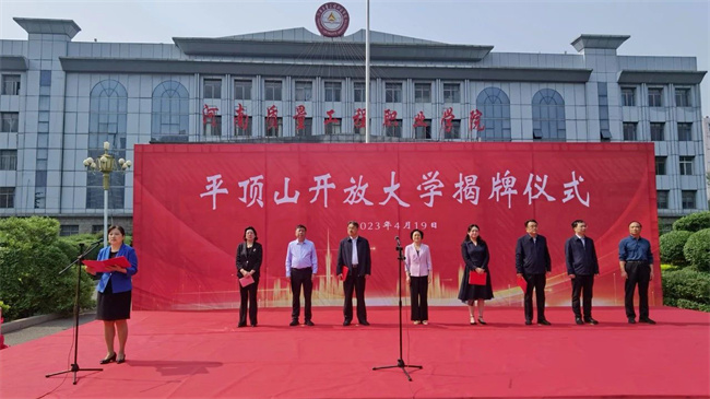 儀式上,趙繼紅和史曉天共同為平頂山開放大學(xué)揭牌。張昌升宣讀了《平頂山市人民政府關(guān)于將平頂山廣播電視大學(xué)更名為平頂山開放大學(xué)的批復(fù)》。