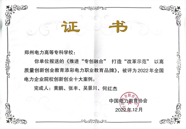 近年來,鄭州電力高等?茖W(xué)校以新時(shí)代“兩越”匠心培養(yǎng)能源革命踐行者、美好生活服務(wù)者,辦人民滿意的電力職業(yè)教育,在創(chuàng)新創(chuàng)業(yè)教育改革實(shí)踐中深入探索,構(gòu)建形成了電力特色大學(xué)生創(chuàng)新創(chuàng)業(yè)教育“專創(chuàng)融合6163模式”,卓越提升了學(xué)生的學(xué)習(xí)能力、實(shí)操能力、適應(yīng)能力、創(chuàng)新能力,增值人才培養(yǎng)高質(zhì)量、賦能學(xué)生核心競爭力、促進(jìn)充分高質(zhì)量就業(yè),創(chuàng)新創(chuàng)業(yè)三大賽連創(chuàng)佳績,學(xué)生榮獲首屆河南省大學(xué)生“創(chuàng)新之星”,項(xiàng)目入選河南省大學(xué)生創(chuàng)業(yè)培優(yōu)計(jì)劃,創(chuàng)新引領(lǐng)創(chuàng)業(yè)、創(chuàng)業(yè)帶動(dòng)就業(yè),畢業(yè)生去向落實(shí)率連續(xù)三年98.50%左右,教育部高校就業(yè)反饋綜合評(píng)價(jià)連續(xù)為A級(jí)。鄭州電力高等專科學(xué)校在2022年全省高校就業(yè)創(chuàng)業(yè)工作會(huì)議典型發(fā)言(?莆ㄒ),入選全國高校畢業(yè)生就業(yè)創(chuàng)業(yè)工作典型案例學(xué)校、河南省首批深化創(chuàng)新創(chuàng)業(yè)教育改革示范高校,榮獲國家技能人才培育突出貢獻(xiàn)單位、國家電網(wǎng)職業(yè)教育和技能人才隊(duì)伍建設(shè)先進(jìn)集體、“河南省五一勞動(dòng)獎(jiǎng)狀”,高質(zhì)量發(fā)展碩果及經(jīng)驗(yàn)被中央廣播電視總臺(tái)新聞?lì)l道、《人民日?qǐng)?bào)》《光明日?qǐng)?bào)》《中國教育報(bào)》《河南日?qǐng)?bào)》等主流媒體宣傳推廣。
