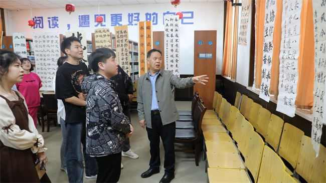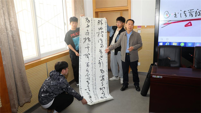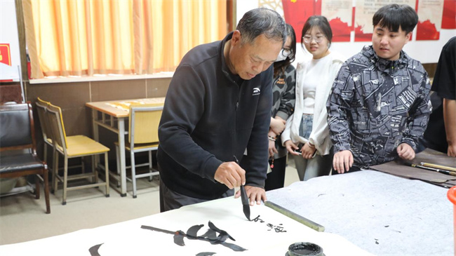 講座結(jié)束后,書(shū)法家們來(lái)到學(xué)校書(shū)法社,對(duì)社員們創(chuàng)作的“共鑄太行豐碑——學(xué)習(xí)弘揚(yáng)紅旗渠精神”主題書(shū)法作品進(jìn)行現(xiàn)場(chǎng)點(diǎn)評(píng),從字法、結(jié)構(gòu)、章法、墨法和臨創(chuàng)中需要注意的布局、濃淡、粗細(xì)、落款等創(chuàng)作元素進(jìn)行了詳細(xì)講解,指出存在的不足和改進(jìn)方法。書(shū)法家們還根據(jù)社員們的書(shū)法學(xué)習(xí)情況,圍繞活動(dòng)主題,進(jìn)行了現(xiàn)場(chǎng)臨創(chuàng)演示,并把創(chuàng)作的書(shū)法作品贈(zèng)送給大家,鼓勵(lì)大家要在實(shí)際行動(dòng)中學(xué)習(xí)踐行紅旗渠精神,在書(shū)法藝術(shù)追求的道路上做到持之以恒,從藝術(shù)中獲取靈感,激發(fā)奮進(jìn)向上的力量。