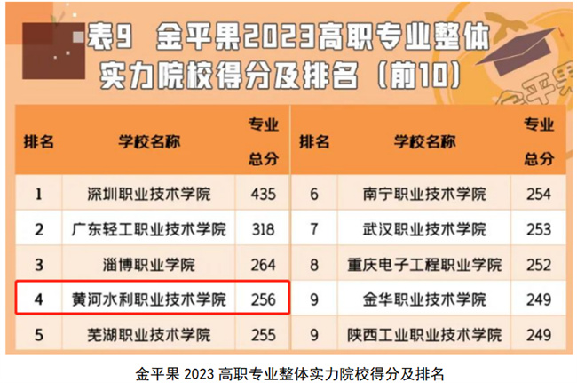 高職專(zhuān)業(yè)群綜合競(jìng)爭(zhēng)力評(píng)價(jià)數(shù)據(jù)顯示,該校水利水電建筑工程、測(cè)繪地理信息技術(shù)2個(gè)高水平專(zhuān)業(yè)群上榜;高職院校分專(zhuān)業(yè)大類(lèi)競(jìng)爭(zhēng)力排行榜顯示,該校資源環(huán)境與安全大類(lèi)、水利大類(lèi)2個(gè)分專(zhuān)業(yè)大類(lèi)位均列全國(guó)第一;高職院校分專(zhuān)業(yè)類(lèi)競(jìng)爭(zhēng)力排行榜顯示,該校測(cè)繪地理信息類(lèi)、水文水資源類(lèi)、水利工程與管理類(lèi)、水土保持與水環(huán)境類(lèi)4個(gè)專(zhuān)業(yè)類(lèi)均位列全國(guó)第一;高職院校專(zhuān)業(yè)競(jìng)爭(zhēng)力排行榜顯示,該校15個(gè)專(zhuān)業(yè)上榜,其中測(cè)繪地理信息技術(shù)、攝影測(cè)量與遙感技術(shù)、地籍測(cè)繪與土地管理、無(wú)人機(jī)測(cè)繪技術(shù)、水文與水資源技術(shù)、水利工程、智慧水利技術(shù)、水利水電建筑工程、水土保持技術(shù)9個(gè)專(zhuān)業(yè)位列全國(guó)第一,工程測(cè)量技術(shù)、測(cè)繪工程技術(shù)、水生態(tài)修復(fù)技術(shù)3個(gè)專(zhuān)業(yè)位列全國(guó)第二,生態(tài)環(huán)境修復(fù)技術(shù)、土木工程檢測(cè)技術(shù)、水利水電工程技術(shù)3個(gè)專(zhuān)業(yè)位列全國(guó)第三。
