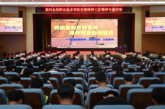 李明金是該校優(yōu)秀校友,他1985年在開(kāi)封市河務(wù)局參加工作,一直扎根基層、駐守一線,主持和參加黃河開(kāi)封河段工程搶險(xiǎn)方案制定和搶護(hù)等800余次,主持完成各類水利工程及黃河生態(tài)廊道建設(shè)項(xiàng)目60余項(xiàng),完成“黃河埽工”申遺等地廳級(jí)以上課題10余項(xiàng),30余項(xiàng)科技創(chuàng)新成果獲地廳級(jí)以上獎(jiǎng)勵(lì),為河南省水利事業(yè)發(fā)展和黃河保護(hù)治理提供了有力的技術(shù)支撐。講座中,他結(jié)合自己三十余年的黃河防汛搶險(xiǎn)工作經(jīng)歷,從愛(ài)崗敬業(yè)、爭(zhēng)創(chuàng)一流、艱苦奮斗、勇于創(chuàng)新、淡泊名利、甘于奉獻(xiàn)的勞模精神,崇尚勞動(dòng)、熱愛(ài)勞動(dòng)、辛勤勞動(dòng)、誠(chéng)實(shí)勞動(dòng)的勞動(dòng)精神,以及敬業(yè)、精益、專注、創(chuàng)新的工匠精神三個(gè)方面給師生們分享了他如何從一名工人通過(guò)不斷學(xué)習(xí)和勞動(dòng)成長(zhǎng)為一名大工匠的奮斗歷程。他鼓勵(lì)學(xué)生要努力學(xué)習(xí)、熱愛(ài)勞動(dòng),盡快成長(zhǎng)為對(duì)社會(huì)和國(guó)家有用的技術(shù)技能人才。