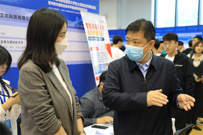 李班在劉志偉陪同下,到場(chǎng)與用人單位、求職應(yīng)聘學(xué)生進(jìn)行親切交談,了解企業(yè)人才需求和學(xué)生求職情況,主張通過(guò)企業(yè)進(jìn)校園,推動(dòng)學(xué)校教學(xué)與企業(yè)崗位的匹配,真正打通校企生融通的橋梁,實(shí)現(xiàn)互利共贏。在大學(xué)生創(chuàng)新創(chuàng)業(yè)項(xiàng)目展示點(diǎn),李班一行就大學(xué)生創(chuàng)業(yè)強(qiáng)調(diào),創(chuàng)新創(chuàng)業(yè)一定要根據(jù)學(xué)生的專業(yè)和市場(chǎng)調(diào)研,對(duì)項(xiàng)目團(tuán)隊(duì)、模式、產(chǎn)品、運(yùn)營(yíng)策略等有清晰的定位和規(guī)劃;在學(xué)校各院系的服務(wù)點(diǎn),李班與各院系負(fù)責(zé)人就學(xué)生培養(yǎng)、就業(yè)方向和企業(yè)等進(jìn)行詳細(xì)交流,鼓勵(lì)院系要多和對(duì)口企業(yè)“打交道、交朋友”,當(dāng)好學(xué)生的“娘家”。