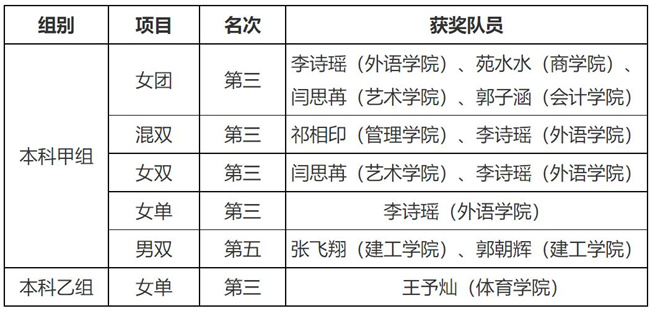 中新河南網(wǎng)5月31日電(李春曉) 5月28日,由河南省教育廳、河南省體育局主辦的河南省第十四屆運(yùn)動(dòng)會(huì)學(xué)生組乒乓球比賽暨河南省第十七屆學(xué)生乒乓球比賽圓滿閉幕。經(jīng)過6天激戰(zhàn),鄭州升達(dá)經(jīng)貿(mào)管理學(xué)院乒乓健兒勇奪本科甲組女子團(tuán)體第三名、混雙第三名、女子雙打第三名、女子單打第三名、男子雙打第五名和乙組女子單打第三名的優(yōu)秀成績,并榮獲“體育道德風(fēng)尚獎(jiǎng)”。隊(duì)員外語學(xué)院李詩瑤和管理學(xué)院祁相印被評為“優(yōu)秀運(yùn)動(dòng)員”,體育學(xué)院教師任重、李春曉被評為“優(yōu)秀教練員”。