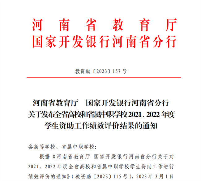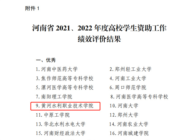 中新河南網(wǎng)5月31日電(董新法) 近日,河南省教育廳會(huì)同國(guó)家開發(fā)銀行河南省分行對(duì)全省高校和省屬中職學(xué)校2021、2022年度學(xué)生資助工作進(jìn)行了全面績(jī)效評(píng)價(jià)。本次績(jī)效評(píng)價(jià)分為學(xué)校自評(píng)、專家組復(fù)評(píng)和實(shí)地復(fù)核三個(gè)階段,考核內(nèi)容包括基礎(chǔ)保障、日常管理、管理績(jī)效和附加評(píng)價(jià)等。在對(duì)155所高校的績(jī)效評(píng)價(jià)中,共有37所高校獲評(píng)“優(yōu)秀”等級(jí),黃河水利職業(yè)技術(shù)學(xué)院位列其中。