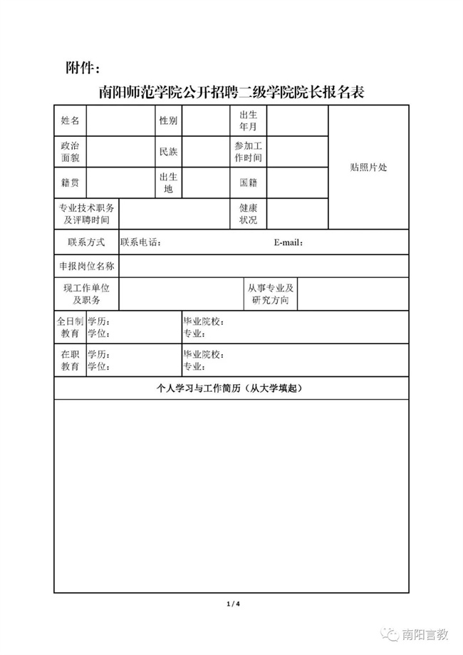 附件:南陽師范學(xué)院公開招聘二級學(xué)院院長報名表