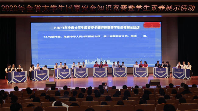 決賽分為競賽和素養(yǎng)展示兩個(gè)環(huán)節(jié)。在競賽環(huán)節(jié),有問必答、爭分奪秒、一站到底三項(xiàng)賽制環(huán)環(huán)相扣、精彩連連,各參賽隊(duì)伍熱情高昂、精神飽滿,沉著應(yīng)對、對答如流,充分展示了當(dāng)代大學(xué)生的風(fēng)采,其精彩表現(xiàn)不時(shí)贏得現(xiàn)場陣陣掌聲。評委組、仲裁組全程督賽,切實(shí)保障大賽公平公正。素養(yǎng)展示活動,各參賽隊(duì)伍圍繞國家安全觀進(jìn)行展演,選手們的精彩演繹,塑造了一個(gè)個(gè)生動立體的角色,講述了一件件發(fā)人深思的故事,引發(fā)了觀眾共鳴與思考。決賽還設(shè)置了觀眾互動環(huán)節(jié)和文藝節(jié)目暖場,為緊張激烈的比賽增添了輕松活躍的氛圍。經(jīng)過激烈角逐,最終河南師范大學(xué)等11支參賽隊(duì)獲得優(yōu)秀獎;平項(xiàng)山學(xué)院、南陽醫(yī)學(xué)高等專科學(xué)校、漯河職業(yè)技術(shù)學(xué)院、河南地礦職業(yè)學(xué)院、洛陽理工學(xué)院5支參賽隊(duì)獲得三等獎;南陽師范學(xué)院、許昌陶瓷職業(yè)技術(shù)學(xué)院、安陽師范學(xué)院3支參賽隊(duì)獲得二等獎;河南中醫(yī)藥大學(xué)參賽隊(duì)獲得一等獎;鄭州大學(xué)、周口文理職業(yè)學(xué)院等25支參賽隊(duì)獲得優(yōu)秀組織獎。