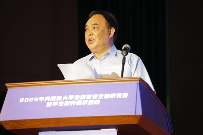 黃才華代表省委教育工委、省教育廳向長期關(guān)心支持高校發(fā)展、百忙中蒞臨此次活動的省委政法委、市公安局的領(lǐng)導(dǎo)同志表示熱烈的歡迎,向觀摩此次比賽活動的高校領(lǐng)導(dǎo)、師生代表表示誠摯的問候,向沖刺到?jīng)Q賽現(xiàn)場的代表隊(duì)表示熱烈的祝賀,向承辦此次比賽活動的河南中醫(yī)藥大學(xué)校領(lǐng)導(dǎo),校黨委宣傳部、黨委學(xué)工部、校團(tuán)委等部門付出的艱辛和努力表示衷心的感謝。黃才華指出,中央和省委高度重視國家安全教育工作,從成立中央國家安全委員會,建立集中統(tǒng)一、高效權(quán)威的國家安全體制,到加快推進(jìn)國家安全法治建設(shè),再到明確國家安全戰(zhàn)略方針和總體部署,一系列重大創(chuàng)新舉措陸續(xù)出臺,為做好國家安全工作提供了根本遵循。省委教育工委、省教育廳認(rèn)真貫徹中央和省委關(guān)于國家安全教育工作的決策部署,在國家安全教育體系建設(shè)、教育資源建設(shè)、教育教學(xué)活動建設(shè)等方面持續(xù)發(fā)力,全省高校國家安全教育工作取得明顯成效。希望各高校以此次活動為契機(jī),深入貫徹落實(shí)總體國家安全觀,將國家安全教育作為立德樹人的重要內(nèi)容,多措并舉推進(jìn)國家安全教育,不斷增強(qiáng)師生國家安全意識和素養(yǎng),為筑牢全省教育系統(tǒng)國家安全防線不斷發(fā)揮高校優(yōu)勢、提供高校智慧、貢獻(xiàn)高校力量。