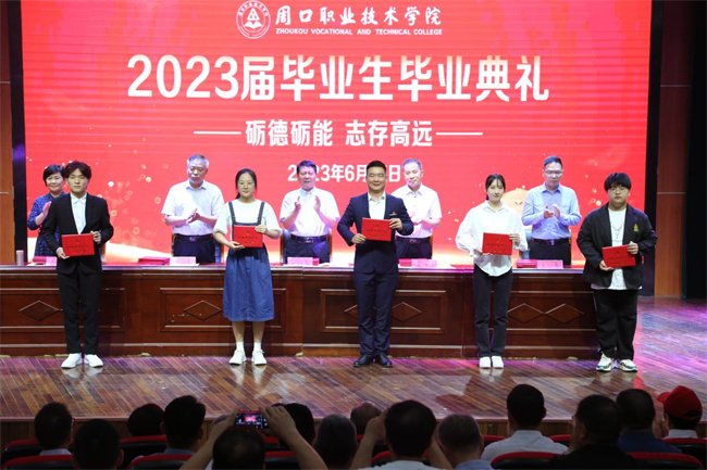 畢業(yè)典禮在莊嚴的國歌聲中拉開帷幕。校黨委副書記、工會主席郭汝禮宣讀《河南省教育廳關于表彰2023年河南省優(yōu)秀應屆大中專畢業(yè)生的決定》;副校長于愛霞宣讀《周口職業(yè)技術學院關于表彰2023年優(yōu)秀大中專畢業(yè)生的決定》。