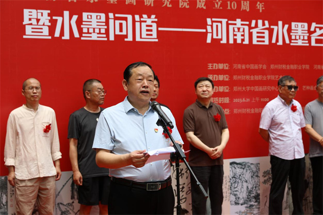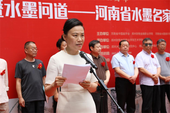 鄭州財稅金融職業(yè)學(xué)院院長程慎為畫展開幕式致辭,他表示:學(xué)校近年來開展了豐富多彩的藝術(shù)教育實踐活動,在公共藝術(shù)教育工作中取得了顯著的成績。水墨問道畫展的舉辦是學(xué)校“高雅藝術(shù)進校園”的一項美育教育實踐活動。美育使人的情感得到陶冶、思想得到凈化、品格得到完善,從而使身心得到和諧發(fā)展,精神境界得到升華,自身得到美化。要用馬克思主義的審美觀教育學(xué)生,培養(yǎng)學(xué)生正確的審美理想、健康的審美情趣,提高對美的感受力、鑒賞力、表現(xiàn)力和創(chuàng)造力。以美引善,提高學(xué)生的思想品德;以美啟真,增強學(xué)生的智力;以美怡情,增進學(xué)生的身心健康。