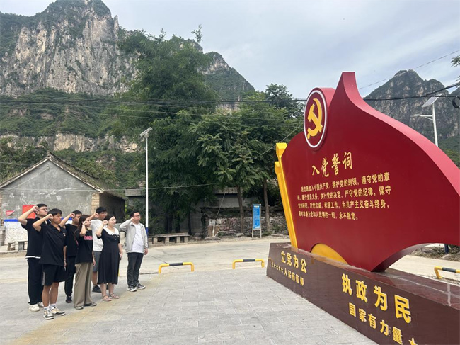隨后,實(shí)踐團(tuán)深入河南省“鄉(xiāng)村旅游特色村”、輝縣市“文明村”圪針莊,對(duì)村莊的黨建工作、特色產(chǎn)業(yè)等進(jìn)行了深入調(diào)研,并對(duì)村支書梁三平進(jìn)行了專訪。梁書記向團(tuán)隊(duì)成員介紹到:通過聚焦黨建引領(lǐng)、產(chǎn)業(yè)發(fā)展等工作,村里建立鄉(xiāng)村振興亭、豐富鄉(xiāng)村文化建設(shè),依托寶泉風(fēng)景區(qū),以養(yǎng)殖業(yè)、種植業(yè)、旅游業(yè)為契機(jī),拓展休閑農(nóng)業(yè)功能,建設(shè)特色民宿,打造品牌化旅游示范區(qū),讓群眾過上更舒心的日子,帶領(lǐng)村民集體致富,目前村民基本在家務(wù)工、許多優(yōu)秀青年返鄉(xiāng)創(chuàng)業(yè)。