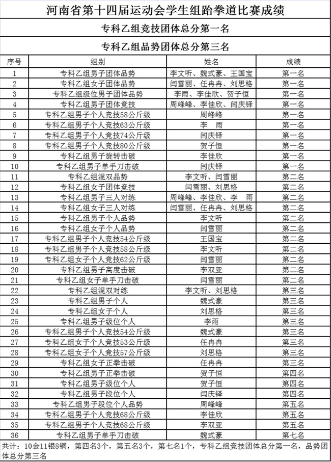 焦作大學(xué)共派出12名跆拳道運(yùn)動(dòng)員參加了本次比賽,共斬獲29枚獎(jiǎng)牌,其中金牌10枚、銀牌11枚、銅牌8枚,同時(shí)獲得專(zhuān)科乙組競(jìng)技團(tuán)體總分第一名、專(zhuān)科乙組品勢(shì)團(tuán)體總分第三名。