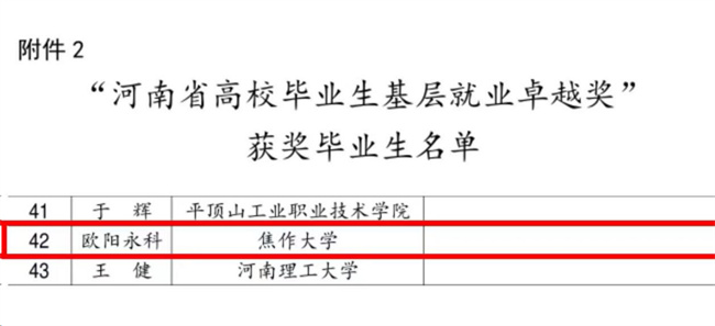 焦作大學畢業(yè)生歐陽永科榮獲河南省高校畢業(yè)生基層就業(yè)卓越獎