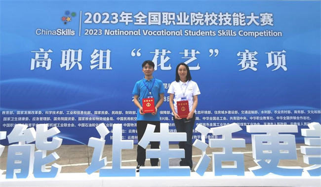 中新河南網(wǎng)7月25日電(王紅波) 7月19至20日,由教育部主辦的2023年全國職業(yè)院校技能大賽高職組“花藝”賽項(xiàng)在云南林業(yè)職業(yè)技術(shù)學(xué)院舉行,來自全國30個省(市、自治區(qū))的59支代表隊(duì)參賽。河南職業(yè)技術(shù)學(xué)院數(shù)字創(chuàng)意與設(shè)計(jì)學(xué)院學(xué)生劉通代表學(xué)校參賽,憑借優(yōu)良的素質(zhì)和扎實(shí)的技能,最終榮獲“花藝”賽項(xiàng)一等獎,教師李寧榮獲“優(yōu)秀指導(dǎo)教師”稱號。