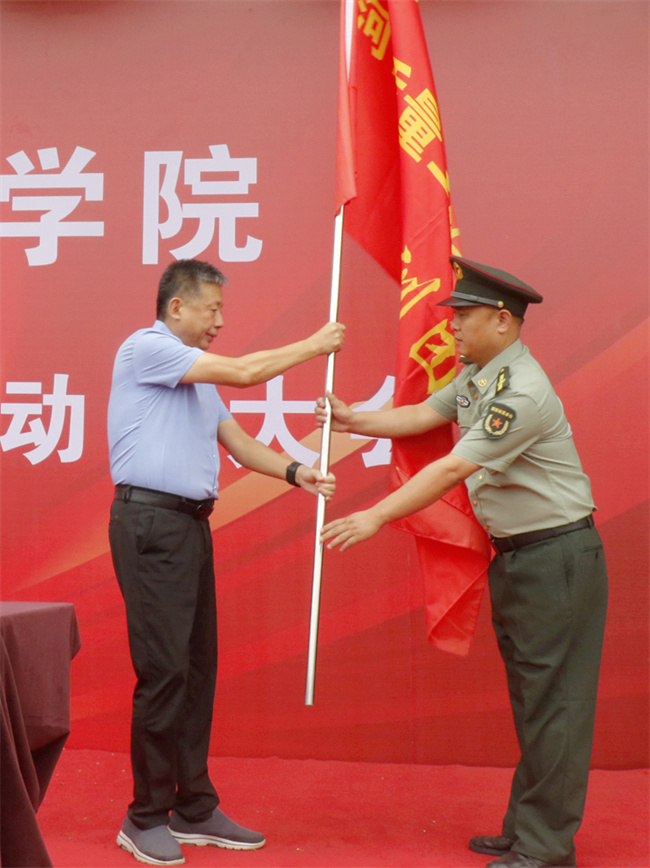 隨后,邱紅標(biāo)向2023級新生軍訓(xùn)團(tuán)團(tuán)長趙振剛授軍訓(xùn)團(tuán)團(tuán)旗。施訓(xùn)教官進(jìn)行了列隊(duì)展演。
