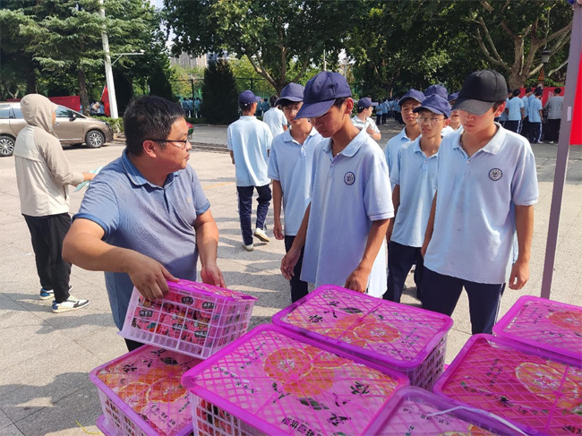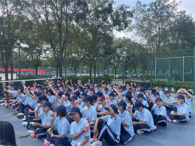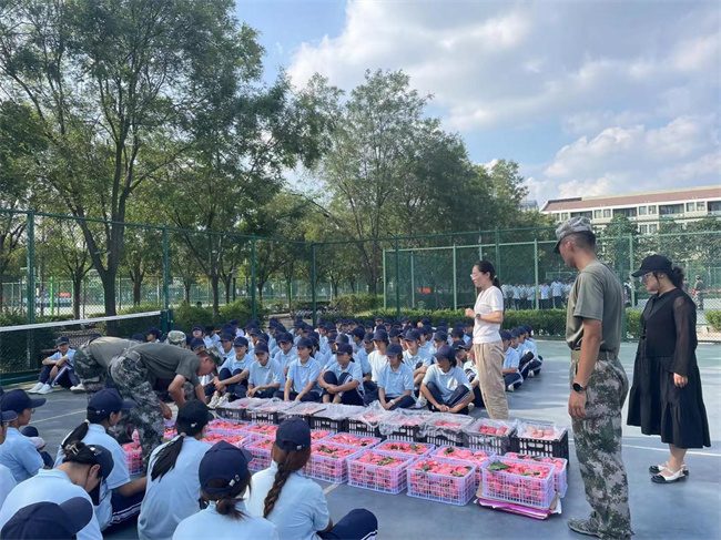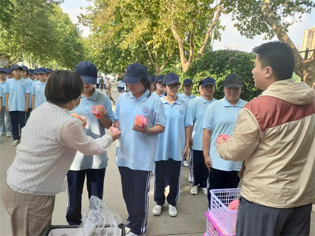 一個個蘋果、橘子發(fā)放到同學們手中,酸酸甜甜的味道驅(qū)離了軍訓的疲憊。“啊,謝謝老師!”“實在是出乎意料,沒想到學校會以這樣的方式慰問我們,原來我們學校也是‘別人家的學校’!”剛領到水果的新生笑著說。