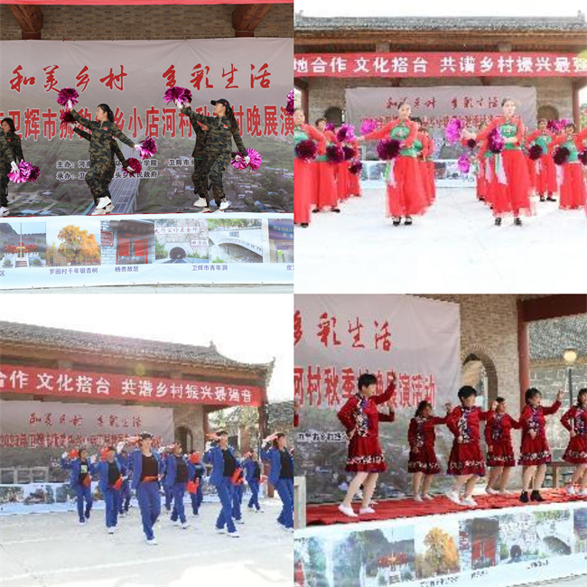 衛(wèi)輝市獅豹頭鄉(xiāng)小店河村、砂掌村、后龍臥村、羅圈村、前龍臥村、白寺村等文藝團(tuán)隊(duì)相繼表演了舞蹈《開門紅》、廣場(chǎng)舞《祝福祖國(guó)》《五星紅旗迎風(fēng)飄揚(yáng)》《喜樂年華》《中國(guó)紅》《中國(guó)美》《多少次想起你》《今天是你的生日我的中國(guó)》、腰鼓《火火的中國(guó)、火火的時(shí)代》、手花舞《紅歌聯(lián)唱》、戲曲《王山要飯》等節(jié)目。