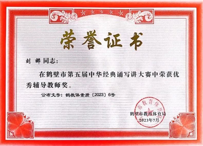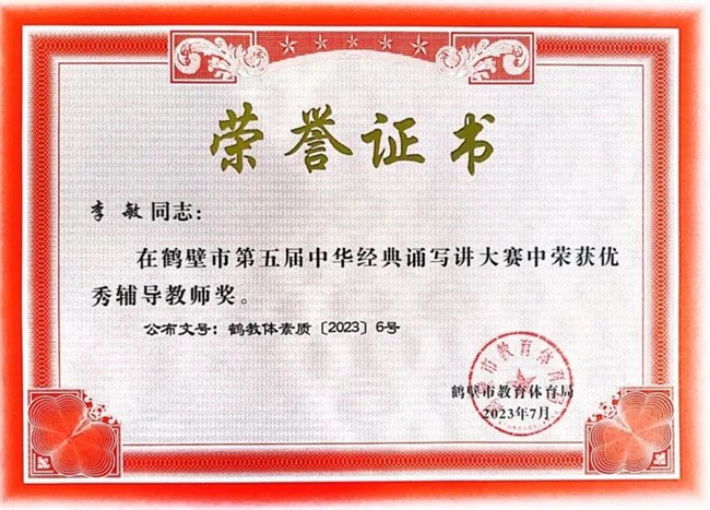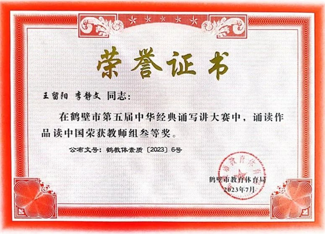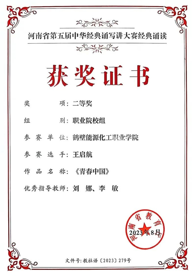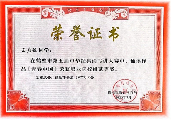 在省級(jí)評(píng)選中,該校高職2021級(jí)嬰幼兒托育服務(wù)與管理班的王啟航同學(xué)的作品《青春中國》獲河南省第五屆中華經(jīng)典誦寫講大賽經(jīng)典誦讀職業(yè)院校組二等獎(jiǎng),劉娜、李敏老師獲“優(yōu)秀指導(dǎo)老師”。
