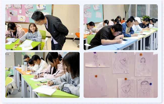 在繪畫的過程中,同學們一邊認真描繪自己的外貌特征,一邊和老師溝通自己的想法。當同學們作畫完畢后,老師對了每一幅作品進行了點評,通過色彩的選擇、線條的運用、形狀的構建等,分析同學們的內心世界和感受。