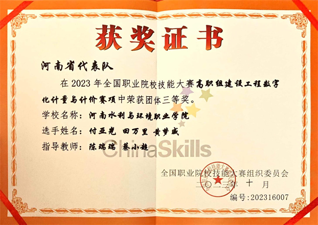 2023年,河南水利與環(huán)境職業(yè)學院各參賽隊伍代表河南省參加全國職業(yè)院校技能大賽,斬獲團體一等獎2項、團體三等獎2項。其中,在地理空間信息采集與處理賽項中,河南水利與環(huán)境職業(yè)學院已是四獲一等獎;在新增賽項水利工程BIM建模與應用賽項中,學校首次參加國賽獲得一等獎;在建筑工程識圖賽項和建設(shè)工程數(shù)字化計量與計價賽項中,學校都實現(xiàn)了獎項突破,充分展現(xiàn)了學校的綜合辦學實力和良好育人成績,是多年來學校堅持“質(zhì)量優(yōu)先、內(nèi)涵發(fā)展”戰(zhàn)略的集中體現(xiàn)。
