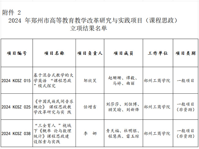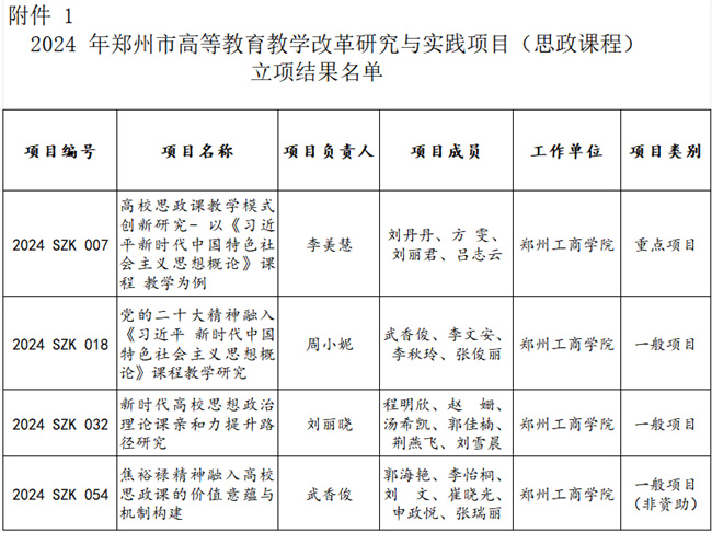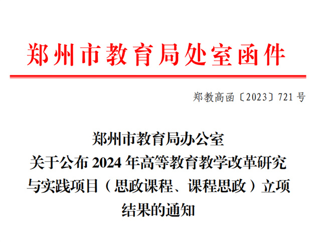 中新河南網(wǎng)11月6日電(史亞麗) 近日,鄭州市教育局發(fā)布了《鄭州市教育局辦公室關(guān)于公布2024年高等教育教學(xué)改革研究與實(shí)踐項(xiàng)目(思政課程、課程思政)立項(xiàng)結(jié)果的通知》(鄭教高函〔2023〕721號)文件,鄭州工商學(xué)院7個(gè)項(xiàng)目獲得立項(xiàng)。其中,思政課程立項(xiàng)項(xiàng)目4項(xiàng),課程思政立項(xiàng)項(xiàng)目3項(xiàng)。