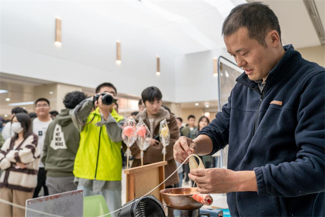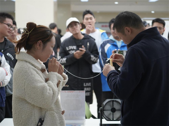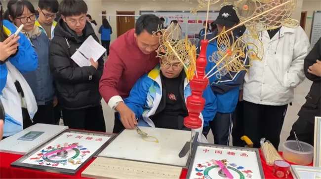 學生現場體驗非遺項目(吹糖人)