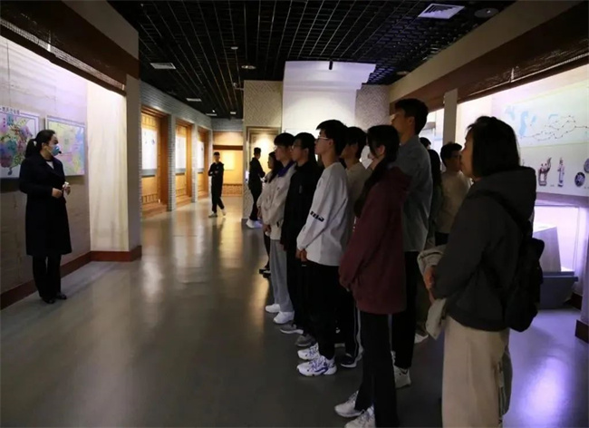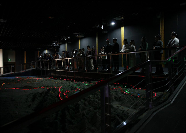 場館里,在巨大的黃河流域沙盤模型前,“幾”字形的黃河貫穿中原大地的景象瞬間映入大家的眼簾,它如同騰飛的巨龍,展示著蜿蜒、雄偉和壯觀;如同時光機,記載著華夏五千年的文明和奮斗史詩;如同母親,滋養(yǎng)著中華大地、哺育著中華兒女。大家通過觀看歷史文獻、文物標(biāo)本和有關(guān)圖文,依次參觀了流域地理、民族搖籃、千秋治河、治河新篇、和諧之路五大展區(qū),多角度、全方位地了解黃河流域的自然概況、文化內(nèi)涵和水資源開發(fā)利用等,強烈感受著我們黨治理黃河的豐功偉績,仔細品味和體會中華民族在治理黃河過程中展現(xiàn)的自強不息、頑強拼搏的奮斗精神。