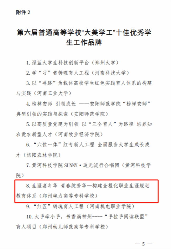 中新河南網(wǎng)11月28日電(王家琪) 近日,河南省第六屆普通高等學(xué)校“大美學(xué)工”評選結(jié)果公示,鄭州電力高等?茖W(xué)校申報(bào)的“生涯嘉年華 青春綻芳華—構(gòu)建全程化職業(yè)生涯規(guī)劃教育體系”獲評十佳學(xué)生工作品牌。“大美學(xué)工”由河南省教育廳組織評選,經(jīng)過網(wǎng)絡(luò)評審、專家評議、現(xiàn)場展示、專家終審等環(huán)節(jié),此次是鄭州電力高等?茖W(xué)校繼2021年連續(xù)第二次獲此殊榮。