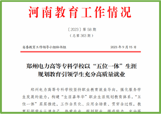 近年來,鄭州電力高等?茖W(xué)校畢業(yè)生初次就業(yè)去向落實(shí)率、年終去向落實(shí)率持續(xù)保持全省前列,就業(yè)行業(yè)集聚度、專業(yè)相關(guān)度、職業(yè)匹配度、就業(yè)穩(wěn)定性均接近90%,就業(yè)指導(dǎo)服務(wù)滿意度、就業(yè)狀況滿意度、母校滿意度等都在99%左右,能源電力行業(yè)占比60%以上,標(biāo)簽企業(yè)占比50%以上,戰(zhàn)略新興產(chǎn)業(yè)占比接近55%,“兩個(gè)畢業(yè)生一個(gè)進(jìn)國企”,電力特色高質(zhì)量充分就業(yè)品牌響亮。教育部就業(yè)反饋評價(jià)A級,省內(nèi)就業(yè)推進(jìn)會典型發(fā)言?莆ㄒ,入選全國就業(yè)典型案例。連續(xù)兩年斬獲河南省大學(xué)生職業(yè)生涯規(guī)劃大賽“規(guī)劃之星”金獎(jiǎng),畢業(yè)生獲評全國高校畢業(yè)生基層就業(yè)卓越獎(jiǎng)、最美未來工匠、最美大學(xué)生、教育部基層就業(yè)典型人物等榮譽(yù)。鄭州電力高等?茖W(xué)校職業(yè)生涯規(guī)劃教育、高質(zhì)量就業(yè)典型經(jīng)驗(yàn)案例被《中國教育報(bào)》《河南日報(bào)》《中國電力報(bào)》《河南教育工作情況》、河南新聞聯(lián)播、教育廳官網(wǎng)等主流媒體平臺宣傳推廣。