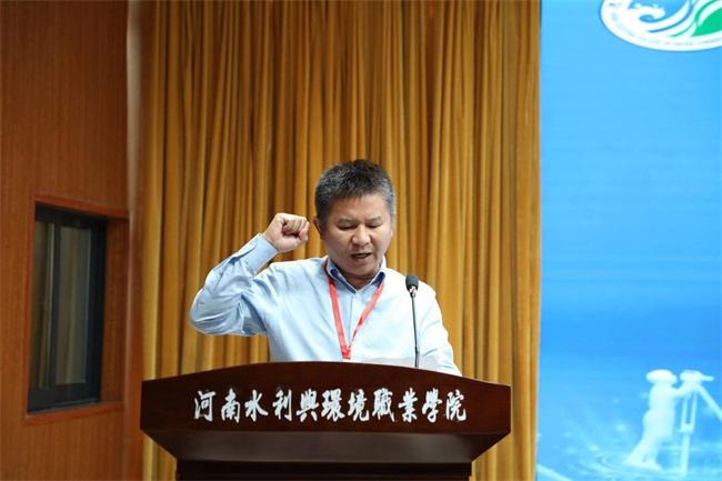 裁判員代表中國礦業(yè)大學(北京)袁德寶教授、參賽選手代表河南水環(huán)學院土木工程系學生穆俊龍依次上臺宣誓,表示要嚴格遵守賽項規(guī)則,公平公正執(zhí)裁和競賽。賽項技術支持企業(yè)廣州南方測繪科技股份有限公司鄭州分公司總經(jīng)理王小剛表示,將盡最大努力為大賽提供技術支持和服務,確保大賽順利進行?偛门虚L翟翊宣布大賽開幕。