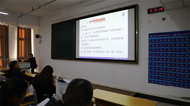 賽項說明會上,翟翊和分項裁判長解放軍信息工程大學西勤教授分別對一級導線測量、二等水準測量和1:500數(shù)字測圖競賽細則進行解讀,明確細則要求、注意事項等內(nèi)容。各參賽隊進行了分組抽簽。