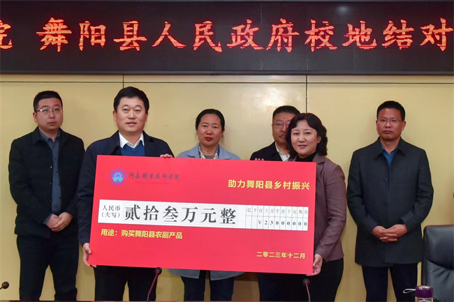 在簽約儀式上,夏新顏總結(jié)回顧了校地結(jié)對(duì)幫扶工作5年來所取得的成績,介紹了學(xué)校今年在教育、文化、科技等方面的幫扶工作情況。夏新顏指出,校地結(jié)對(duì)幫扶是貫徹落實(shí)中央和省委關(guān)于脫貧攻堅(jiān)和鄉(xiāng)村振興工作戰(zhàn)略決策部署一項(xiàng)重要任務(wù)。5年來,學(xué)校充分發(fā)揮人才、科技、智力、培訓(xùn)等方面的優(yōu)勢,積極開展校地結(jié)對(duì)幫扶舞陽縣脫貧攻堅(jiān)、鄉(xiāng)村振興工作,幫扶工作取得豐碩成果。夏新顏希望雙方以此次簽約儀式為契機(jī),進(jìn)一步加強(qiáng)溝通協(xié)調(diào),完善長效合作機(jī)制,為舞陽縣各項(xiàng)事業(yè)的發(fā)展貢獻(xiàn)河職力量?椎掠鄬(duì)學(xué)校多年來給予舞陽的大力支持和幫扶表示感謝,并希望學(xué)校繼續(xù)發(fā)揮國家“雙高計(jì)劃”建設(shè)院校優(yōu)勢,加強(qiáng)在人才、培訓(xùn)、科技、教育和文化等方面的幫扶,進(jìn)一步深化雙方結(jié)對(duì)幫扶成果,推動(dòng)舞陽縣鄉(xiāng)村振興和經(jīng)濟(jì)社會(huì)高質(zhì)量發(fā)展。隨后,夏新顏與孔德余交接了消費(fèi)幫扶牌匾,田華與李曉勇簽署了校地幫扶鄉(xiāng)村振興框架協(xié)議。