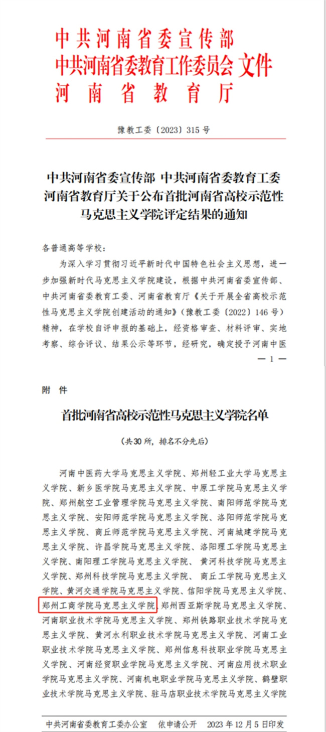 中新河南網(wǎng)12月12日電(劉麗曉)近日,中共河南省委宣傳部、中共河南省委教育工委、河南省教育廳聯(lián)合印發(fā)《關(guān)于公布首批河南省高校示范性馬克思主義學(xué)院評(píng)定結(jié)果的通知》,鄭州工商學(xué)院馬克思主義學(xué)院獲評(píng)首批“河南省高校示范性馬克思主義學(xué)院”。