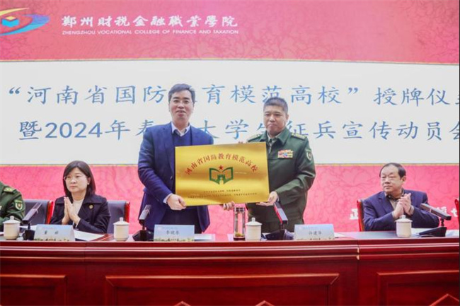 中新河南網(wǎng)12月14日電(王曉彤) 12月12日,鄭州財稅金融職業(yè)學院在厚德樓二樓學術報告廳舉行“河南省國防教育模范高校”授牌儀式暨2024年春季大學生征兵宣傳動員會。會議宣讀了由中共河南省委宣傳部、河南省教育廳、河南省軍區(qū)戰(zhàn)備建設局、動員局、政治工作局聯(lián)合下發(fā)的《河南省國防教育模范高校創(chuàng)建活動考評情況的通報》(豫軍政〔2023〕184號),該校被授予首屆“河南省國防教育模范高校”榮譽稱號。