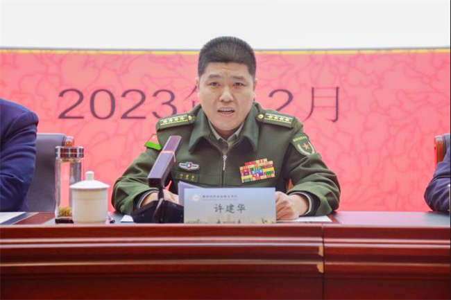 鄭州警備區(qū)大校副司令員許建華為學校授牌并講話,管城區(qū)委常委、人武部上校政委李勇主持會議。該校黨委書記程慎、院長李曉東、黨委副書記董娣、副院長施長春、管城區(qū)人武部中校副部長王根成出席會議。