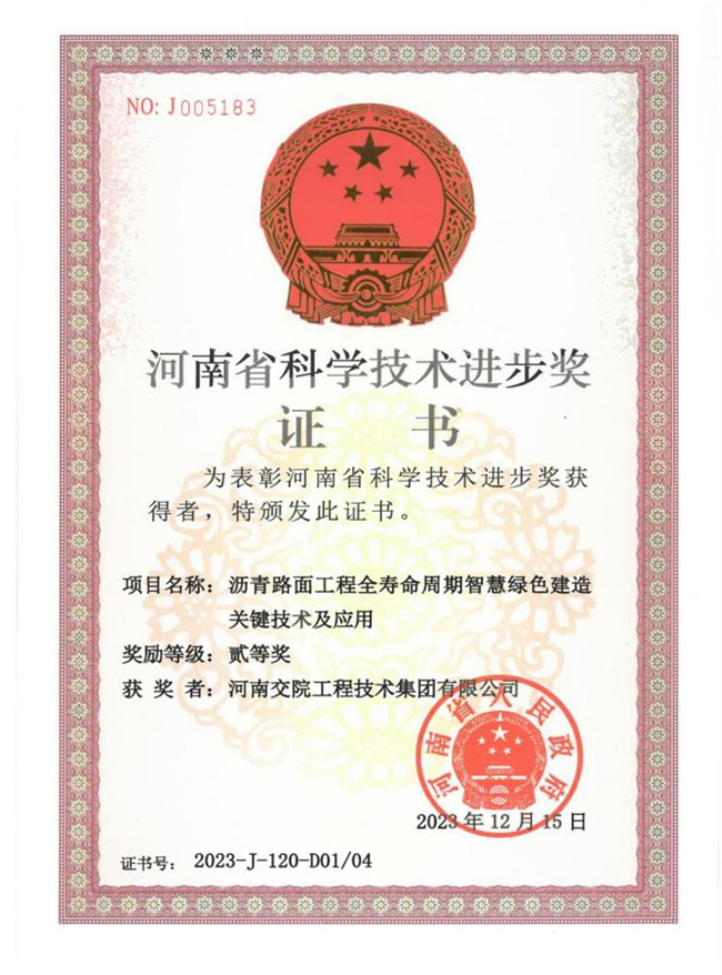 由河南交通職業(yè)技術(shù)學(xué)院校屬企業(yè)河南交院工程技術(shù)集團(tuán)有限公司(以下簡稱:交院技術(shù)集團(tuán))牽頭完成的“瀝青路面工程全壽命周期智慧綠色建造關(guān)鍵技術(shù)及應(yīng)用”科技成果榮獲“河南省科學(xué)技術(shù)進(jìn)步獎(jiǎng)二等獎(jiǎng)”。這是校屬企業(yè)交院技術(shù)集團(tuán)繼2021年、2022年獲獎(jiǎng)后,再次榮獲河南省科學(xué)技術(shù)進(jìn)步獎(jiǎng)二等獎(jiǎng)。