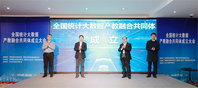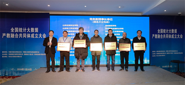 大會舉行統(tǒng)計大數(shù)據(jù)產(chǎn)教融合共同體啟動儀式,宋雪清、孫中太、滕磊、劉錄林四位領(lǐng)導(dǎo)共同上臺見證這一時刻。與會領(lǐng)導(dǎo)分別為輪值理事長單位、常務(wù)副理事長、副理事長單位授牌。
