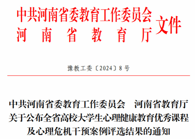 中新河南網(wǎng)1月21日電(王家琪) 近日,省委教育工委、省教育廳在全省高校開(kāi)展的大學(xué)生心理健康教育優(yōu)秀課程及心理危機(jī)干預(yù)案例評(píng)選結(jié)果揭曉,鄭州電力高等專(zhuān)科學(xué)校報(bào)送的《大學(xué)生心理健康教育》課程獲評(píng)河南省高校心理健康教育優(yōu)秀課程,《以愛(ài)筑防,轉(zhuǎn)危為機(jī)—例因親密關(guān)系引發(fā)輕生危機(jī)的干預(yù)報(bào)告》案例獲評(píng)河南省大學(xué)生心理危機(jī)干預(yù)優(yōu)秀案例。