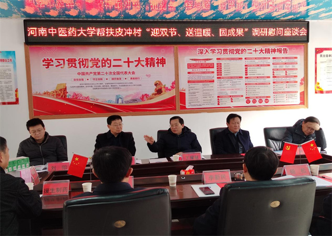 在固始縣皮沖村,王耀獻一行在固始縣縣長李新民,縣委常委、縣委辦主任游安光,副縣長楊松,武廟集鎮(zhèn)鎮(zhèn)長余勛建等陪同下,參觀了“皮沖村生態(tài)文化體驗館”,察看了學校援建的河堤安全護欄等項目,看望慰問了駐村工作隊員和脫貧戶。在皮沖村村委會議室,駐村第一書記王北溟、第一團支部書記馬運鋒分別就“五星”支部創(chuàng)建、2023年定點幫扶工作情況和下一步工作打算及團建工作進行了匯報。皮沖村黨支部書記陳金括代表全體村民向大學領導和駐村隊員的辛勤付出表示真誠感謝。李新民代表縣委、縣政府向河南中醫(yī)藥大學多年來對皮沖村的幫扶和駐村工作隊的無私奉獻表示衷心的感謝,希望結(jié)合固始縣產(chǎn)業(yè)優(yōu)勢,與大學在中醫(yī)藥科技領域開展進一步合作,全面推進固始縣鄉(xiāng)村振興。王耀獻對駐村工作取得的成績給予充分肯定,指出學校定點幫扶工作在全省高校成績考核中連續(xù)2年獲得第一名,這是駐村工作隊扎根基層一線,踏實工作,辛勤努力的結(jié)果。