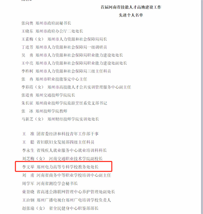 鄭州電力高等?茖W(xué)校教師獲得首屆河南省技能人才高地建設(shè)工作先進(jìn)個(gè)人表彰