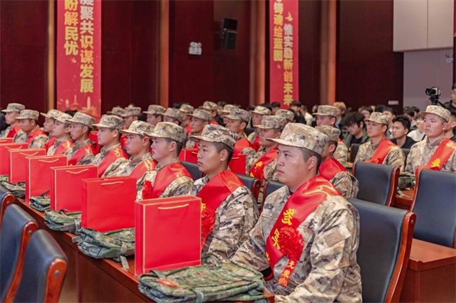 學院退伍復學學生代表為入伍新兵佩戴紅花并發(fā)放紀念品
