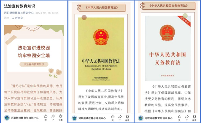 學(xué)校各部門(mén)、各二級(jí)學(xué)院也紛紛開(kāi)展了學(xué)習(xí)研討、繪制海報(bào)、主題班會(huì)等形式多樣的法治教育宣傳活動(dòng),并圍繞憲法、國(guó)家安全、預(yù)防青少年犯罪等相關(guān)主題,通過(guò)學(xué)校網(wǎng)站、微信公眾號(hào)等平臺(tái)推送法律知識(shí),引導(dǎo)全校師生將“學(xué)法、知法、守法”內(nèi)化于心,外化于行。