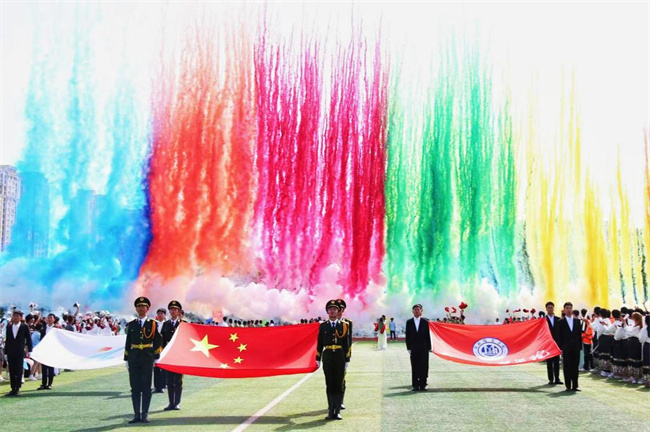 校長呂振合宣布運(yùn)動會正式開幕,現(xiàn)場彩煙齊放,掌聲雷動,氣氛激昂。