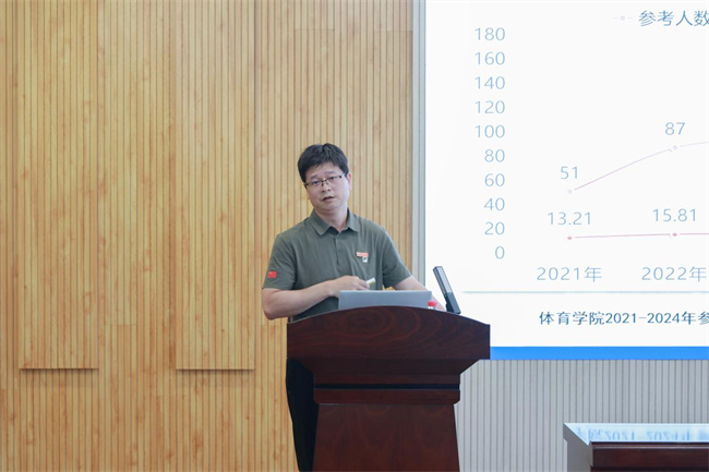 體育學(xué)院院長(zhǎng)謝明以《以學(xué)生成長(zhǎng)為中心,著力提高體育生考研率》為題,圍繞學(xué)生近幾年考研情況,詳細(xì)介紹了考研過程中的工作舉措、考研工作中面臨的考驗(yàn),以豐富的內(nèi)容為其他學(xué)院提供了詳實(shí)具體的經(jīng)驗(yàn)指導(dǎo)。