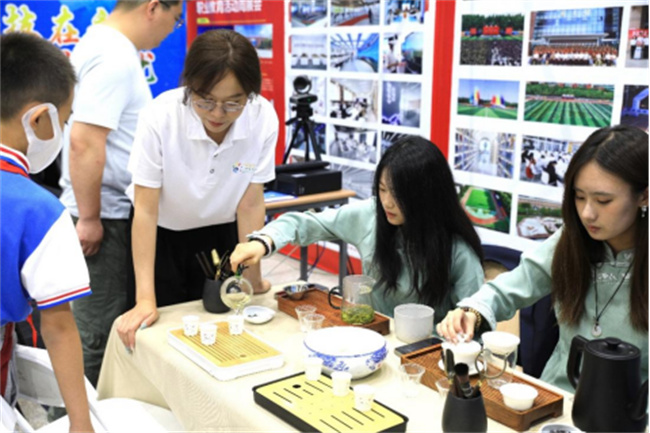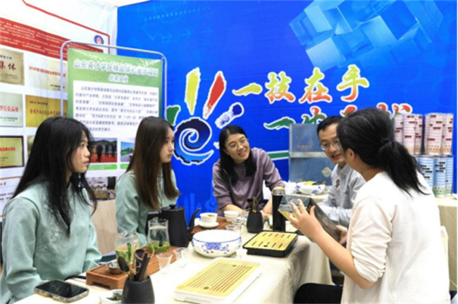 在展覽現(xiàn)場,山東英才學(xué)院展區(qū)以其獨(dú)特的“北茶文化”體驗(yàn)展示項(xiàng)目吸引了大量參觀者駐足。該項(xiàng)目通過茶藝表演、茶品品鑒、茶文化直播等多種形式,全方位展示了茶文化的深厚底蘊(yùn)和獨(dú)特魅力。