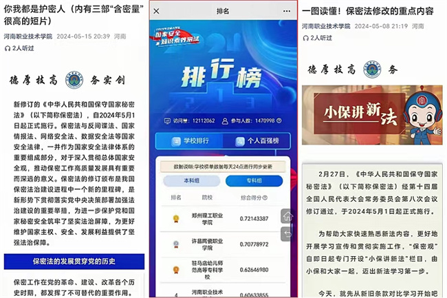 學(xué)校高度重視保密宣傳教育月活動,積極創(chuàng)新宣傳教育形式,扎實(shí)推進(jìn)保密宣傳教育走深走實(shí)。一是精心組織全民國家安全教育日保密宣傳活動。為百余名領(lǐng)導(dǎo)干部發(fā)放保密工作學(xué)習(xí)資料,進(jìn)一步提高領(lǐng)導(dǎo)干部保密工作的責(zé)任意識和保密能力。組織1.3萬余名學(xué)生參加國家安全知識素養(yǎng)測試競賽活動,參賽成績在全省名列前茅。二是“線上+線下”同步進(jìn)行保密宣傳主題展覽。通過學(xué)校官網(wǎng)、微信公眾號、海報(bào)展示、視頻輪播、板報(bào)設(shè)計(jì)和懸掛條幅等形式,向師生大力宣傳保密法律法規(guī)、保密技術(shù)防范和警示教育案例,營造濃厚的保密宣傳氛圍。三是開展“尋找最美保密法治代言人”微視頻征集活動。鼓勵師生積極創(chuàng)作保密宣傳教育微視頻,通過演示日常工作學(xué)習(xí)生活中泄密的風(fēng)險(xiǎn)隱患,向全社會詮釋、宣傳新修訂保密法,普及保密知識,進(jìn)一步強(qiáng)化師生保密守密意識和能力。四是邀請校內(nèi)外專家開展保密咨詢和知識講座。學(xué)校以法治教育宣傳周“法治講堂”“法律診所”等活動為契機(jī),邀請多位專家學(xué)者和保密工作先進(jìn)單位代表,來校開展安全保密、法律法規(guī)、涉密管理等宣講培訓(xùn)和答疑解惑,讓保密法治意識在全校師生中根植于心、熟記于腦。五是廣泛開展教職工保密知識競賽活動。依托“省直工會”平臺,組織600余名教職工參加保密知識競賽,進(jìn)一步增強(qiáng)了全校教職工保密安全意識和筑牢保密工作防線。六是深入班級開展特色教育實(shí)踐活動。組織各二級學(xué)院廣泛運(yùn)用主題班會專題宣講、精品課堂教育引導(dǎo)、公示欄警示教育、保密知識進(jìn)宿舍、保密觀影、參觀保密工作先進(jìn)單位、保密工作志愿者服務(wù)和保密宣誓簽字等多種形式,開展保密宣傳教育工作,切實(shí)增強(qiáng)全校學(xué)生的保密意識,筑牢保密安全觀。